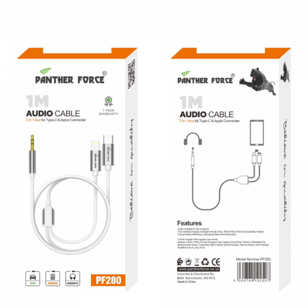 PF280 – Panther Force 1M AUX Cable for Type-C & Apple Connectors