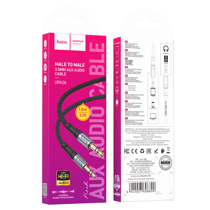 UPA26 Fresh, AUX audio cable 3.5mm male to 3.5mm male, Hi-Fi lossless transmission, long lifespan, nylon braid and zinc alloy connectors