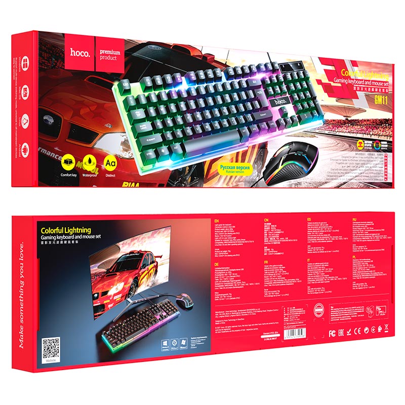 GM11 Terrific glowing, gaming keyboard and mouse set, USB connection, LED tri-color rainbow light, designed for games, ergonomic design, fast response, EN / RU optional.