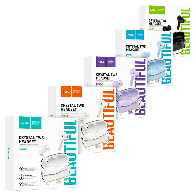 EW54 Rayo, TWS headset, BT v5.3, charging case battery 300mAh, headset battery 30mAh, 4 hours of use and 150 hours of standby