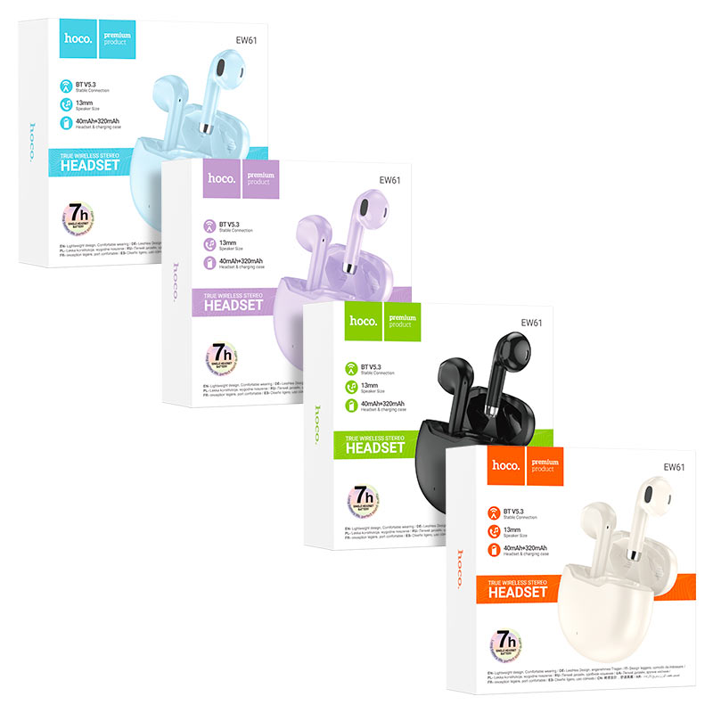 EW61 June, TWS headset, BT v5.3, charging case battery 320mAh, headset battery 40mAh, 7 hours of use and 180 hours of standby