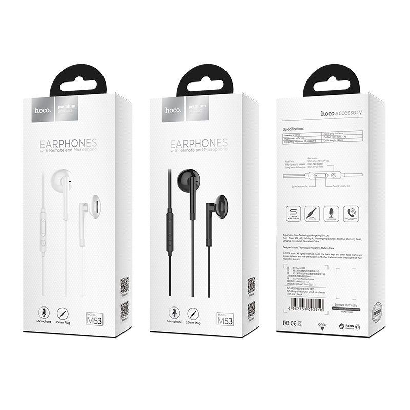 Wired earphones 3.5mm “M53 Exquisite sound†with microphone and 1.2m high elastic cable single button control.