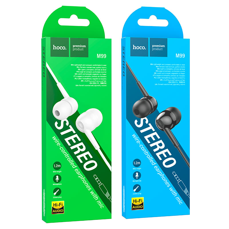M99 Celestial, wired earphones with mic, 1.2m, 3.5mm plug, single-button control.