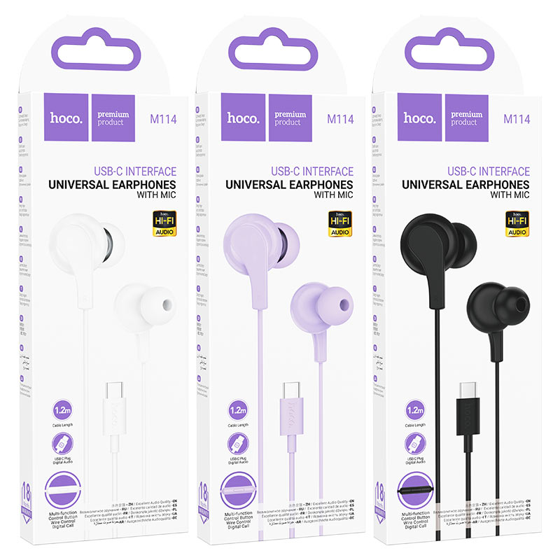 M114 Jia, wired earphones with mic, 1.2m, Type-C plug, wire control, supports calls