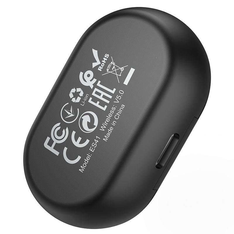 ES41 Clear sound TWS wireless headset with mic, BT V5.0, 40mAh headset battery for 5 hours of calls and music and 200 hours of standby, with 400mAh charging case.