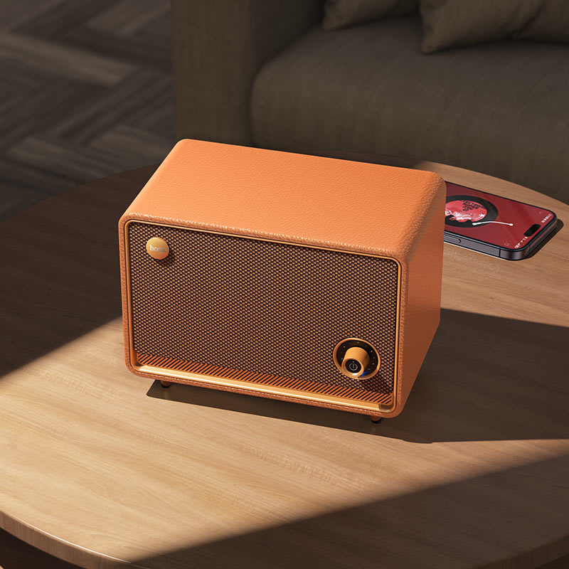 12. Retro design, wooden housing, leather texture, fabric mesh.