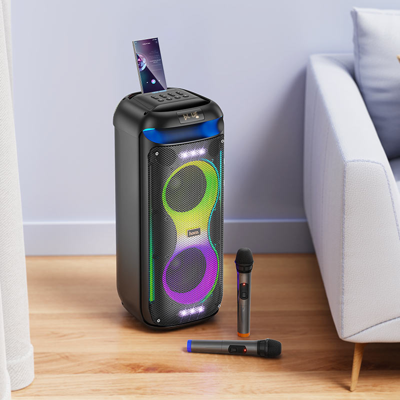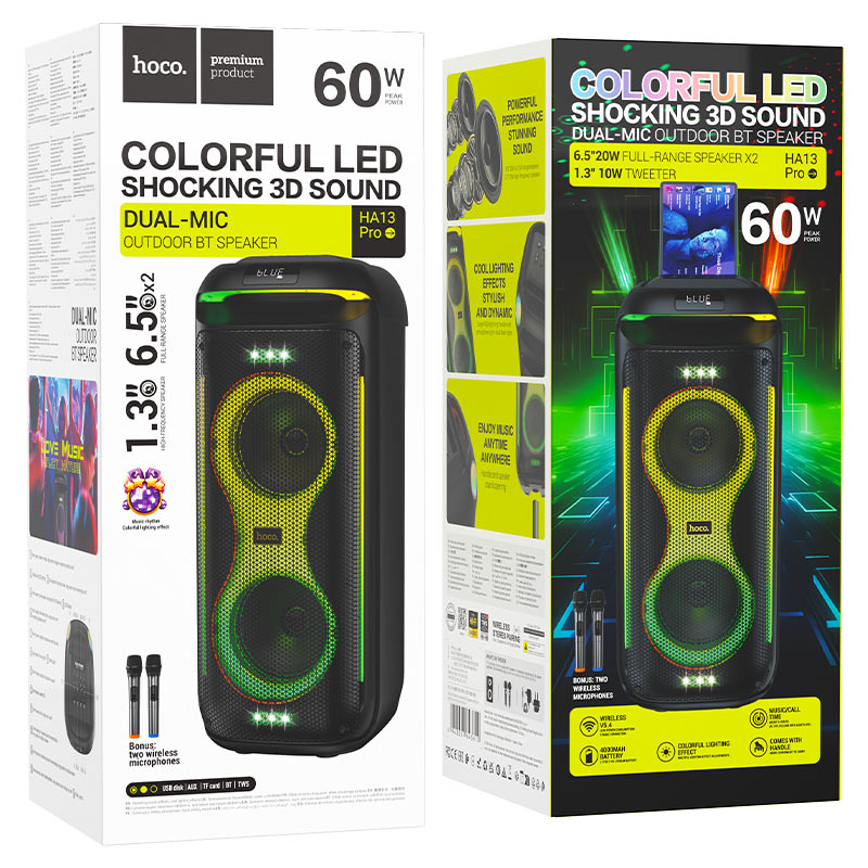 HA13 Pro Ramon, outdoor wireless speaker, BT v5.4, 5-6 hours of work, supports BT, TF card, USB flash drive, AUX, TWS playback modes, RGB light, with 2 wireless microphones